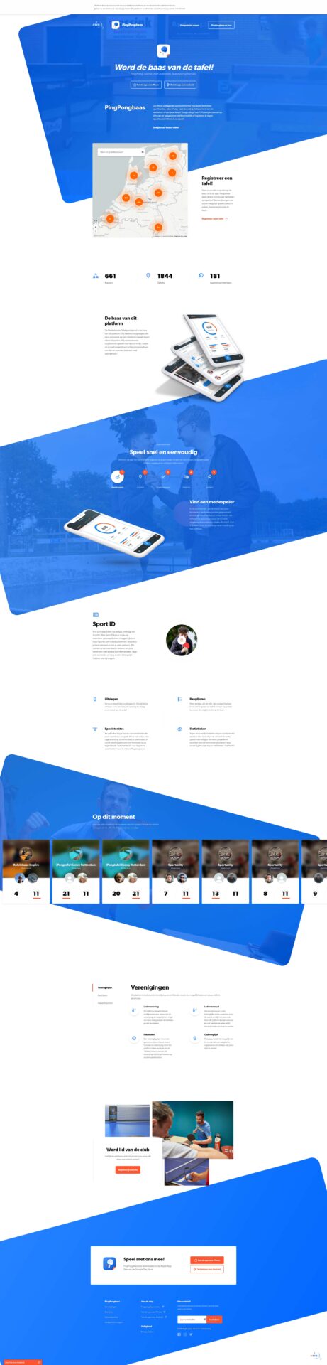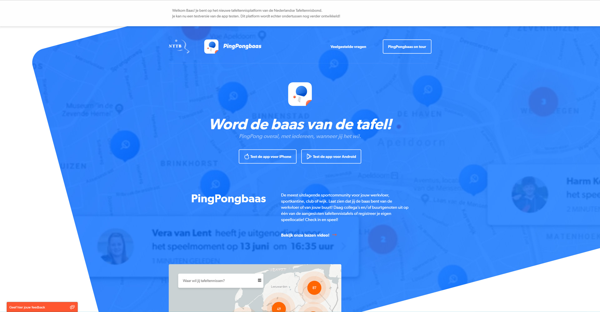 Voor De Nederlandse Tafeltennisbond heb ik mij tijdens mijn werkzaamheden bij Sportunity bezig mogen houden met het ontwikkelen van de website van PingPongbaas.club. Op deze website kunnen gebruikers informatie over de app vinden, maar ook speellocaties en recente speelmomenten bekijken.